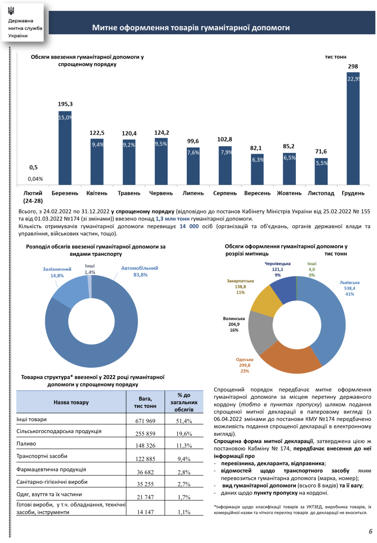 Таким чином, в умовах воєнного стану збережено функціональність та позитивну динаміку збільшення перерахувань митних та інших платежів до дохідної частини бюджету. Показники надходжень до державного бюджету зросли від 7,7 млрд гривень у березні до 36,7 млрд гривень у грудні 2022 р.