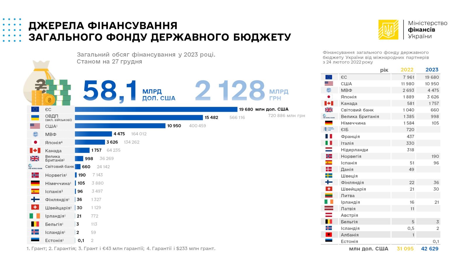 У 2023 році Мінфін України залучив 42,6 млрд доларів США пільгового та грантового фінансування від міжнародних партнерів
