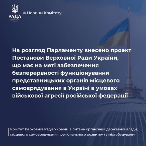 У Комітеті з питань організації державної влади опрацьовується проект Постанови, що має на меті забезпечення безперервності функціонування представницьких органів місцевого самоврядування в Україні в умовах військової агресії російської федерації