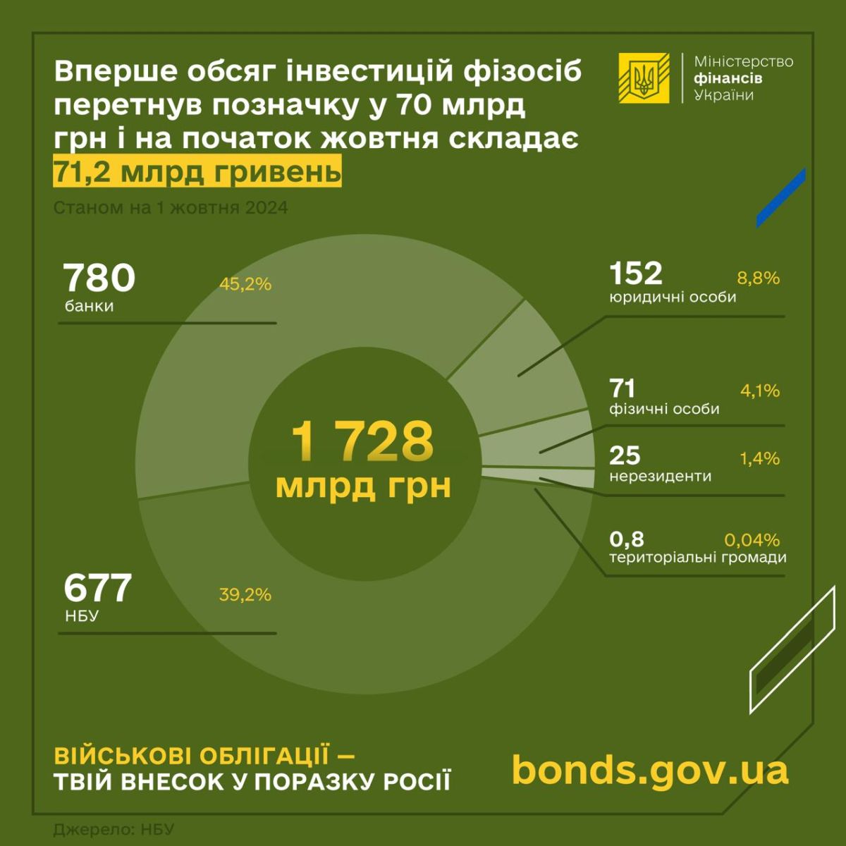 Станом на 1 жовтня, в обігу перебувають ОВДП на понад 1,73 трлн гривень. Найбільша частка знаходиться у комерційних банків (45,2%) та НБУ (39,2%). Частка юридичних осіб та фізичних осіб – 8,8% та 4,1% відповідно. Частка нерезидентів складає 1,4%, а територіальних громад – 0,04%.