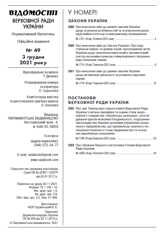 У черговому номері збірника нормативно-правових актів парламентського видавництва «Відомості Верховної Ради України» №49 від 3 грудня 2021 року опубліковано ряд законів і постанов, прийнятих під час п’ятої та шостої сесій Верховної Ради дев’ятого скликання.