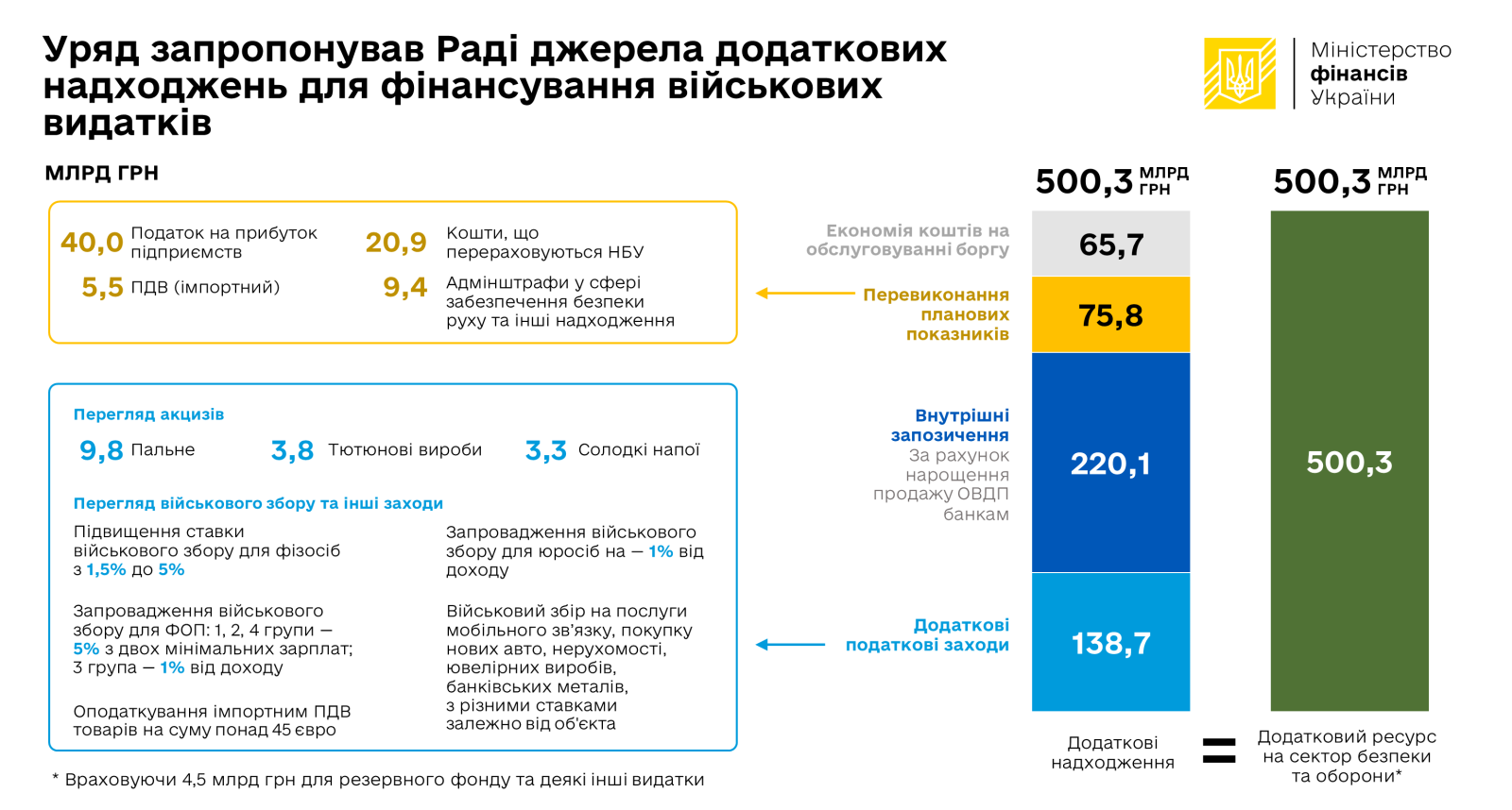 Перегляд військового збору та деякі інші заходи дозволять мобілізувати на сектор безпеки та оборони ресурсів на + 121,8 млрд грн, з яких: