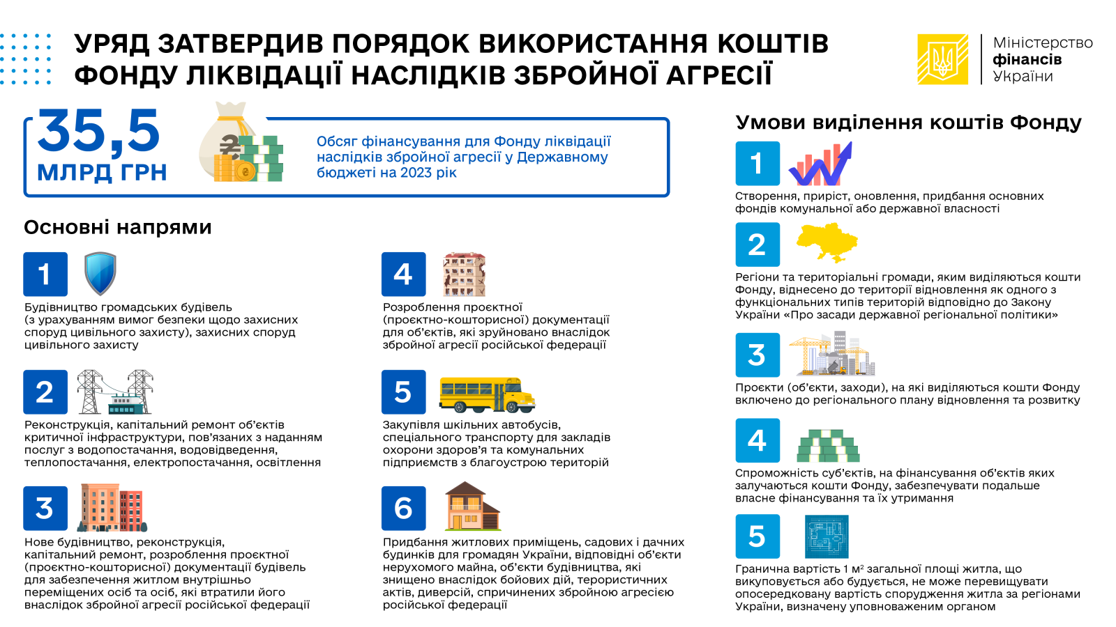 У Державному бюджеті України на 2023 рік для Фонду ліквідації наслідків збройної агресії передбачено фінансування у розмірі 35,5 млрд гривень.