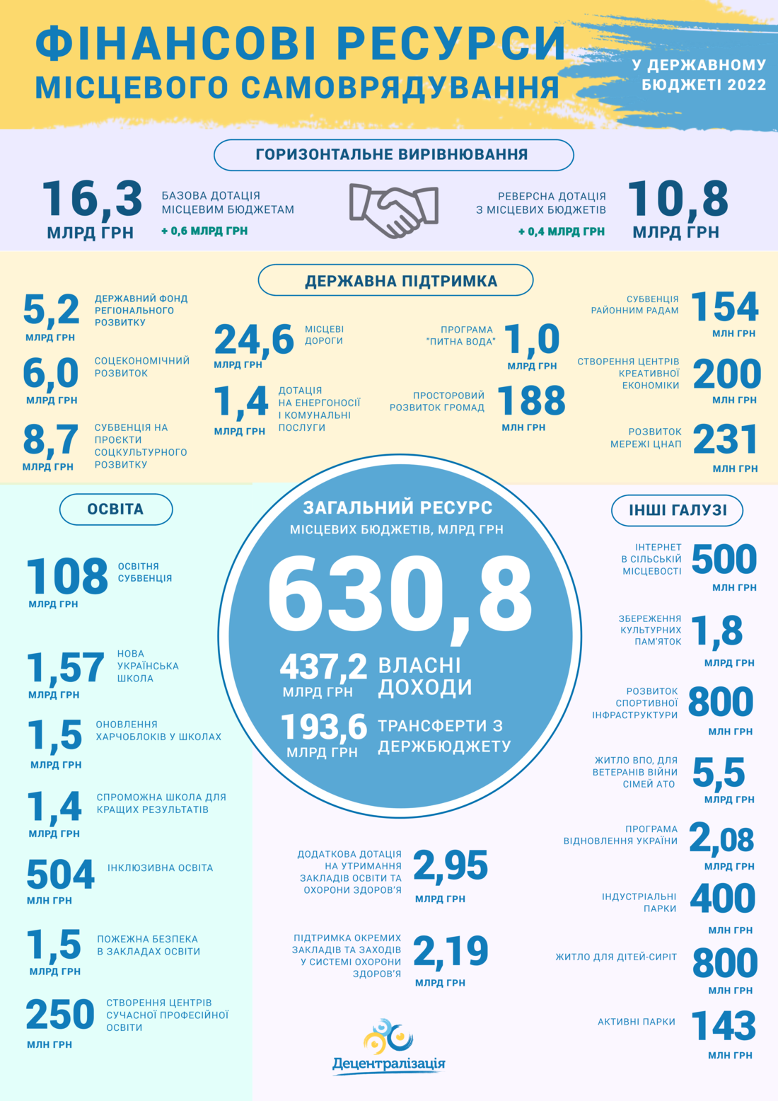 Згідно з документом, загальний обсяг фінансового ресурсу місцевих бюджетів на 2022 рік становитиме 630,8 млрд грн, в тому числі: