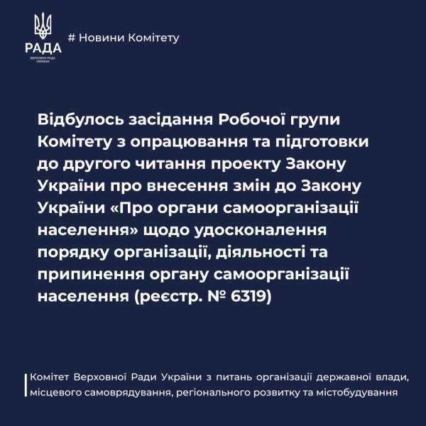 27 серпня 2025 року в режимі відеоконференції на платформі ZOOM за участі народних депутатів України, представників Міністерства розвитку громад та територій України, органів місцевого самоврядування та їх провідних асоціацій, органів самоорганізації населення, громадського та експертного середовища відбулось засідання Робочої групи Комітету з опрацювання та підготовки до другого читання проекту Закону України про внесення змін до Закону України «Про органи самоорганізації населення» щодо удосконалення порядку організації, діяльності та припинення органу самоорганізації населення (реєстр. № 6319).