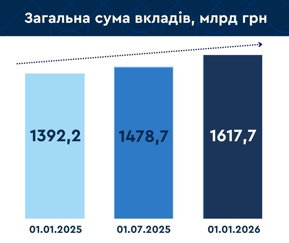 Станом на 1 січня 2026 року загальна сума вкладів фізичних осіб (у т.ч. фізичних осіб-підприємців) у банках України склала понад 1 617,7 млрд грн, що на 225,5 млрд грн більше за аналогічний показник минулого року.