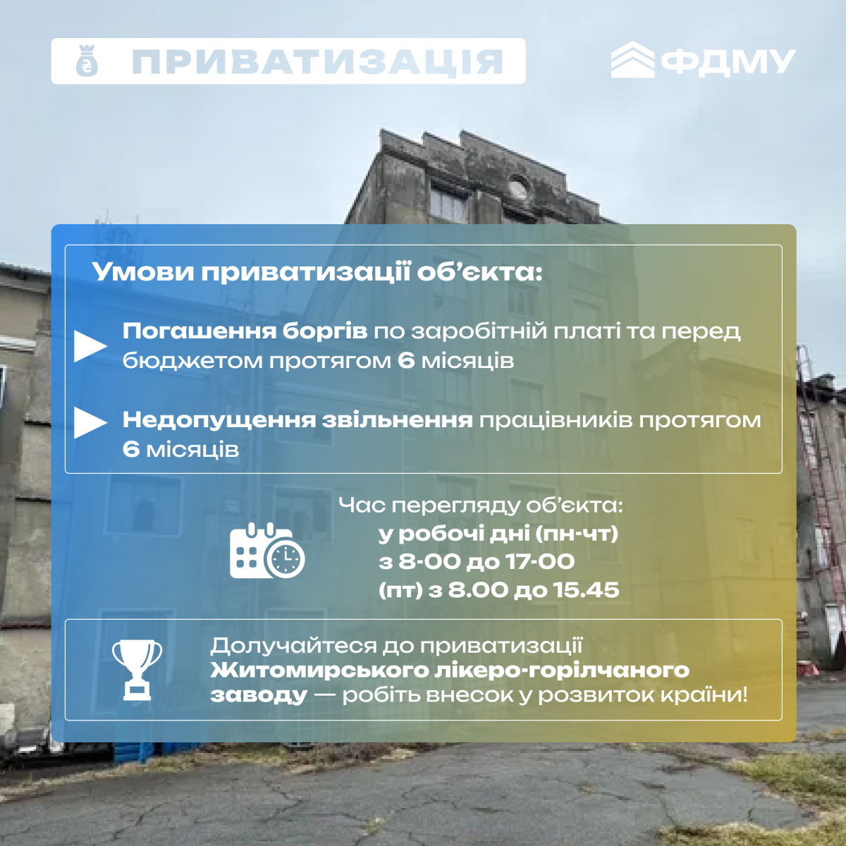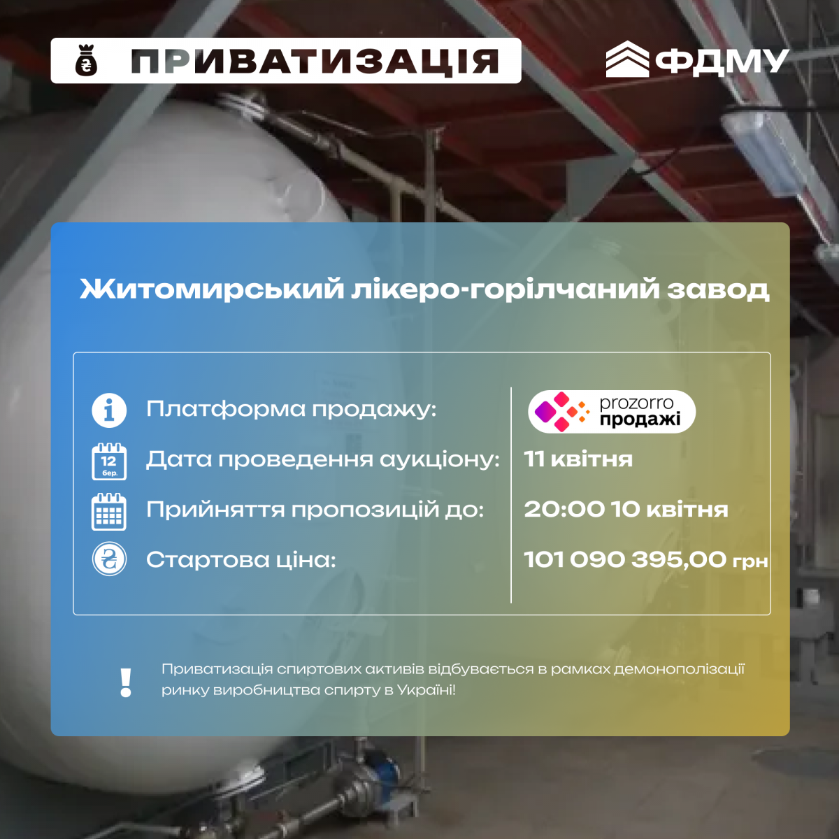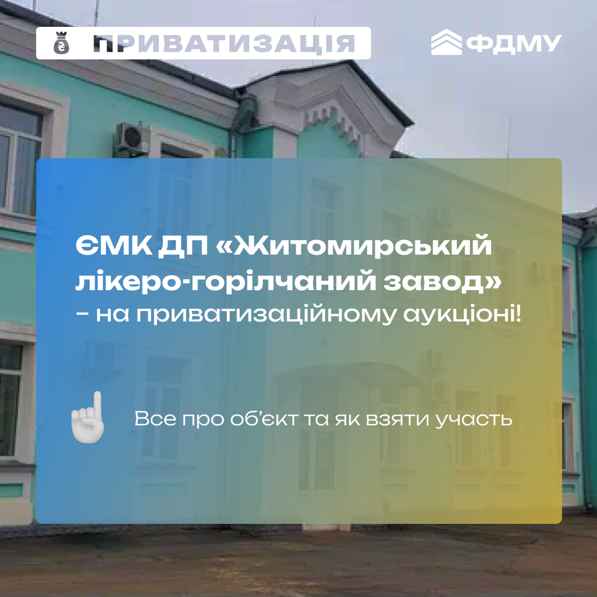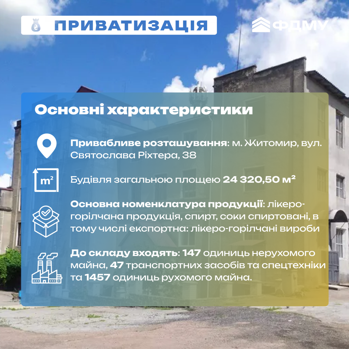 11 квітня Фонд державного майна проведе онлайн-аукціон з приватизації Житомирського лікеро-горілчаного заводу! Це чудова нагода для інвесторів, зацікавлених у ринку алкогольних напоїв, стати власником бізнесу зі значним потенціалом розвитку.