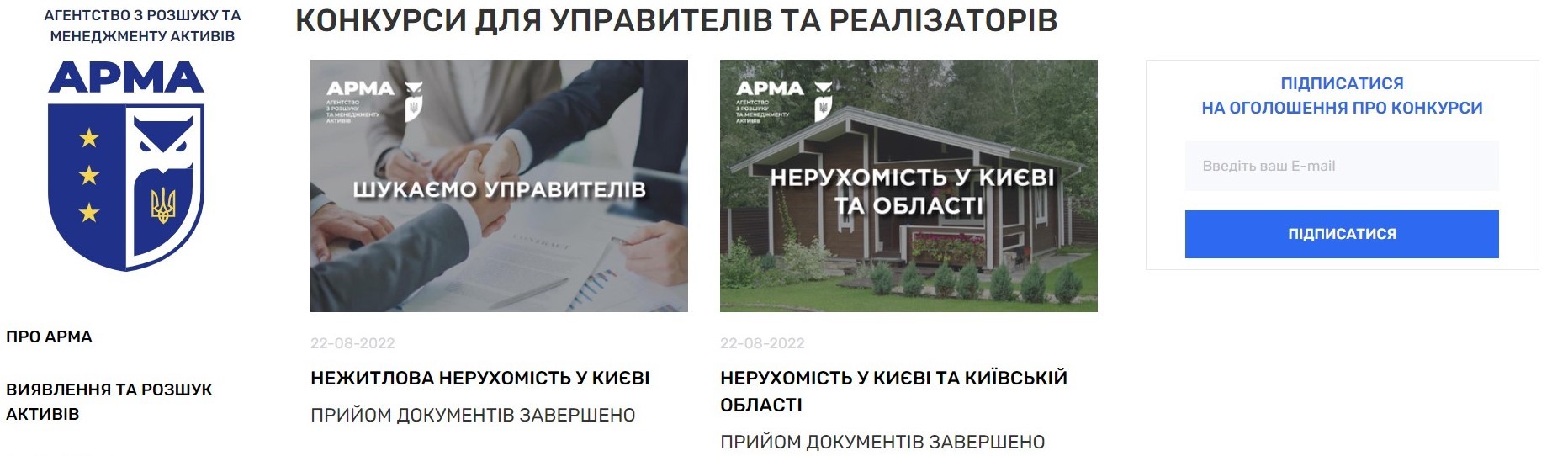У підрозділі «Конкурси для управителів та реалізаторів» на офіційному вебсайті АРМА - https://arma.gov.ua/asset_management - з’явилась можливість підписки на оголошення про конкурсні відбори управителів арештованими активами та юридичних осіб, які здійснюють реалізацію арештованого майна.