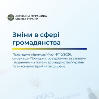 Таким чином, з прийняттям Указу Президента України № 110/2026 процедури у сфері громадянства стали чіткими та прозорими, зокрема, для іноземців та осіб без громадянства, які разом з громадянами України стали на захист територіальної цілісності та недоторканності нашої держави, а також членів родин таких іноземців та осіб без громадянства.