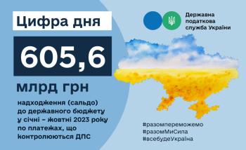 За оперативними даними надходження (сальдо) до державного бюджету у січні – жовтні 2023 року по платежах, що контролюються ДПС, становлять 605,6 млрд гривень. Надходження (с...