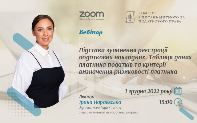 1 грудня о 15:00 НААУ за ініціативою Комітету з питань митного та податкового права організовує вебінар на тему «Підстави зупинення реєстрації податкових накладних. Таблиця даних платник...