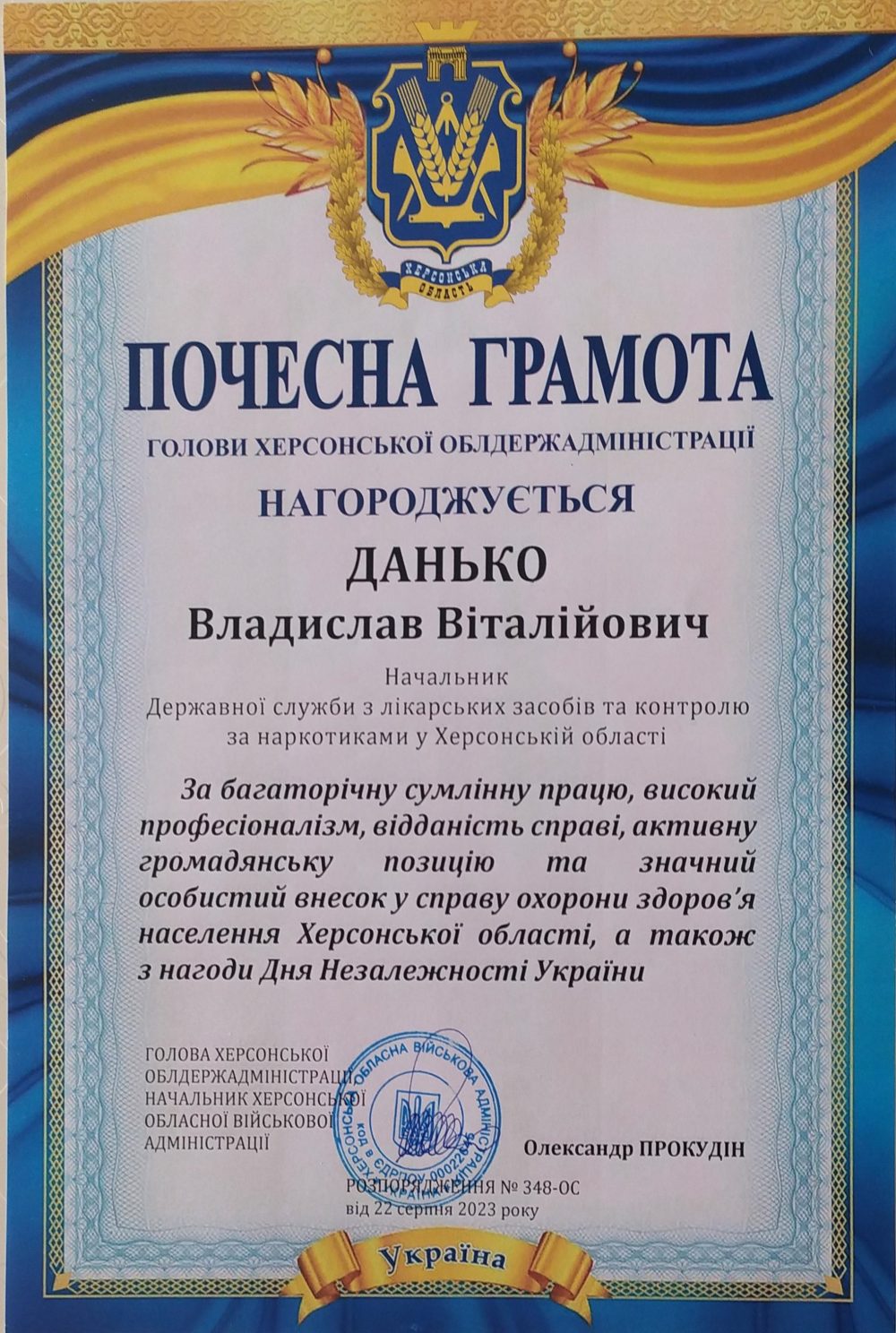 Начальника Державної служби з лікарських засобів та контролю за наркотиками у Херсонській області Владислава Данька за сумлінну працю, відданість справі, значний особистий внесок у спра...